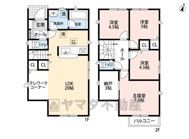 LDK20畳(1F)、洋4.5畳(2F)、洋5畳(2F)、洋7.5畳(2F)、S3畳(2F) |