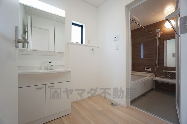 同仕様写真。三面鏡つき洗面台。収納も一体型になっているので、ドライヤーやヘアアイロンの置き場に困りません。