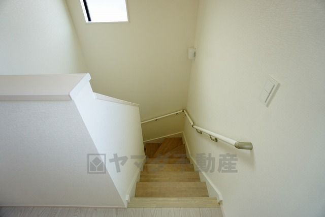 同仕様写真。小さなお子様やご高齢の方でも安心できる、手すり付き階段。段差も低めで設定されており、安全性にも優れています。