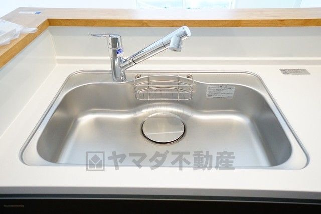 広々としたステンレスシンクには、洗剤やスポンジを収納出来るラック付き。広さも確保しているので、大きなお鍋も洗いやすいです。