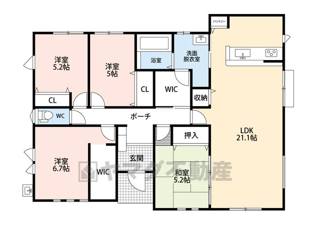 LDK21.1畳(1F)、和5.2畳(1F)、洋5畳(1F)、洋5.2畳(1F)、和6.7畳(1F) |