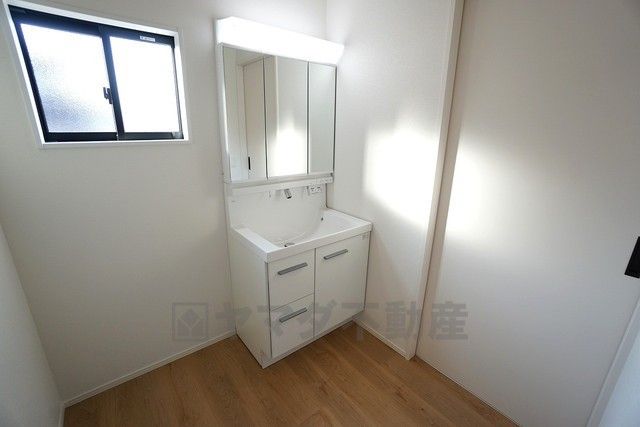 同仕様写真。三面鏡つき洗面台。鏡裏にたっぷりとした収納スペースがあります。鏡を閉めてしまえば小物は見えないため、スッキリとした印象の洗面台にできます。