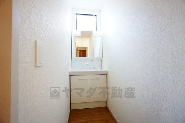 三面鏡つき洗面台。鏡裏にたっぷりとした収納スペースがあります。鏡を閉めてしまえば小物は見えないため、スッキリとした印象の洗面台にできます。