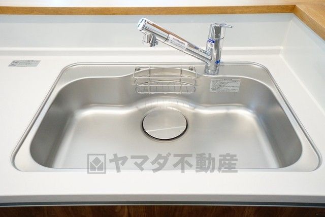 広々としたステンレスシンクには、洗剤やスポンジを収納出来るラック付き。広さも確保しているので、大きなお鍋も洗いやすいです。