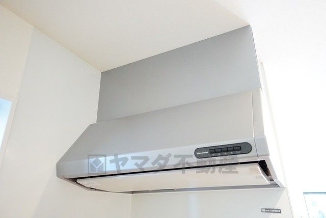 風量が弱・強と切替え可能なレンジフードが調理中の煙をしっかり吸い込みます。手元を照らすライト付きです。