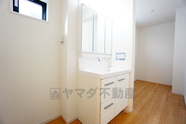 洗面脱衣室内に便利なフリースペースを確保。 収納棚を設ければタオルや日用品のストック置場として活躍します。 ランドリースペースや室内物干しコーナーとしても使える、家事動線を考えた設計です。
