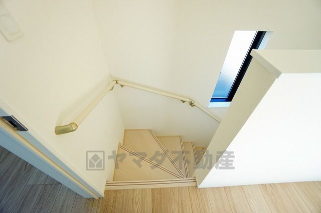 小さなお子様やご高齢の方でも安心できる、手すり付き階段。段差も低めで設定されており、安全性にも優れています。