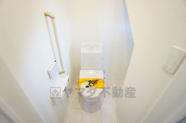 温水洗浄機付トイレです。節水機能もあるので、安心して使えますね。もちろん、1階2階の2ヶ所にトイレがあるので、忙しい朝にもゆとりができますね。