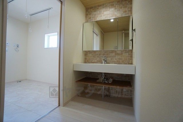 同仕様写真。三面鏡つき洗面台。鏡裏にたっぷりとした収納スペースがあります。鏡を閉めてしまえば小物は見えないため、スッキリとした印象の洗面台にできます。