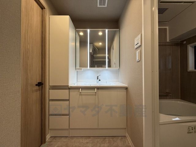 三面鏡裏収納付き洗面化粧台です^^ 歯磨きセットやスキンケア用品などの収納に便利ですね。 生活感も隠すことができ、来客時にも安心です。