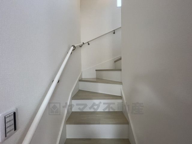 小さなお子様やご高齢の方でも安心できる、手すり付き階段。段差も低めで設定されており、安全性にも優れています。