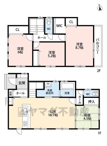 LDK16.7畳(1F)、和4.5畳(1F)、洋5.2畳(2F)、洋6畳(2F)、洋8.7畳(2F) |
