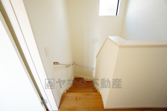 小さなお子様やご高齢の方でも安心できる、手すり付き階段。段差も低めで設定されており、安全性にも優れています。