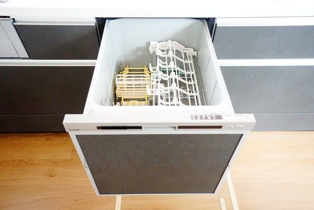 食事の後の手間を解消する食器洗い乾燥機付。冬場の洗い物で手荒れの悩みもなくなります。手洗いよりも節約できて便利。