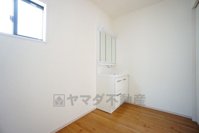 三面鏡つき洗面台。鏡裏にたっぷりとした収納スペースがあります。鏡を閉めてしまえば小物は見えないため、スッキリとした印象の洗面台にできます。