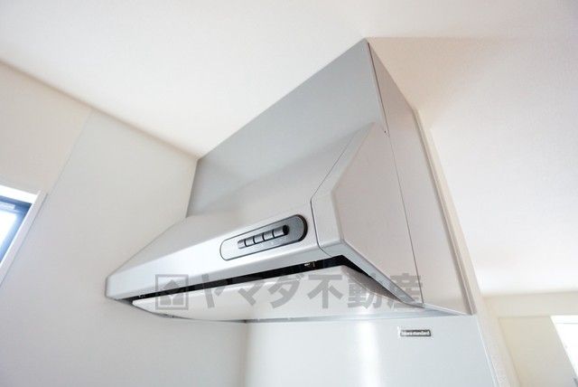 風量が弱・強と切替え可能なレンジフードが調理中の煙をしっかり吸い込みます。手元を照らすライト付きです。