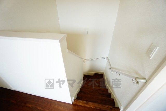 小さなお子様やご高齢の方でも安心できる、手すり付き階段。段差も低めで設定されており、安全性にも優れています。
