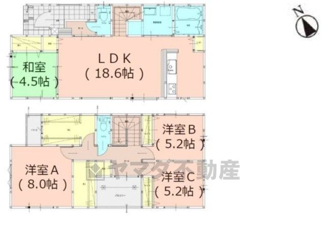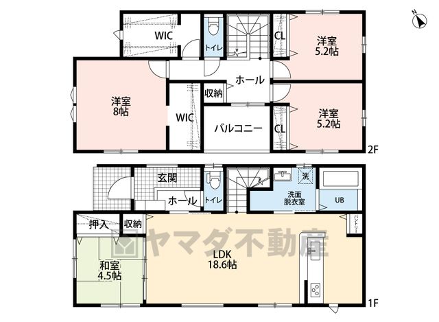 LDK18.6畳(1F)、和4.5畳(1F)、洋5.2畳(2F)、洋8畳(2F) |