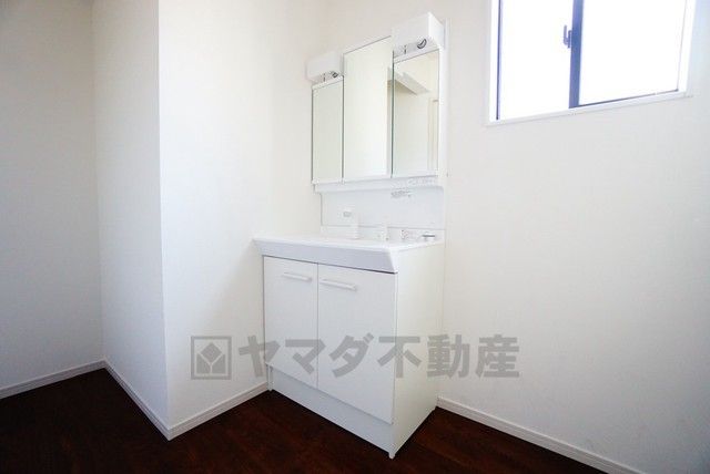 三面鏡つき洗面台。鏡裏にたっぷりとした収納スペースがあります。鏡を閉めてしまえば小物は見えないため、スッキリとした印象の洗面台にできます。
