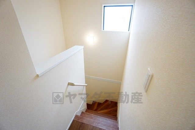 小さなお子様やご高齢の方でも安心できる、手すり付き階段。段差も低めで設定されており、安全性にも優れています。