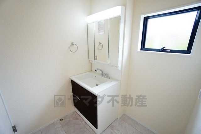 三面鏡つき洗面台。鏡裏にたっぷりとした収納スペースがあります。鏡を閉めてしまえば小物は見えないため、スッキリとした印象の洗面台にできます。