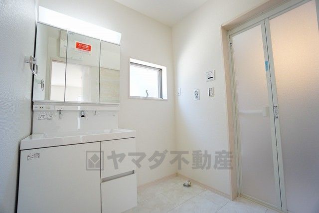 同仕様写真。三面鏡つき洗面台。鏡裏にたっぷりとした収納スペースがあります。鏡を閉めてしまえば小物は見えないため、スッキリとした印象の洗面台にできます。
