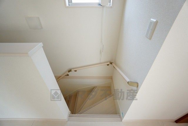 同仕様写真。小さなお子様やご高齢の方でも安心できる、手すり付き階段。段差も低めで設定されており、安全性にも優れています。