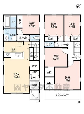 LDK16畳(1F)、S4.5畳(1F)、洋4.4畳(2F)、洋5.2畳(2F)、洋8畳(2F) |