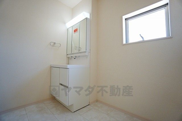 同仕様写真。三面鏡つき洗面台。収納も一体型になっているので、ドライヤーやヘアアイロンの置き場に困りません。