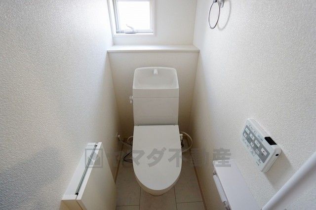 同仕様写真。温水洗浄機付トイレです。節水機能もあるので、安心して使えますね。もちろん、1階2階の2ヶ所にトイレがあるので、忙しい朝にもゆとりができますね。