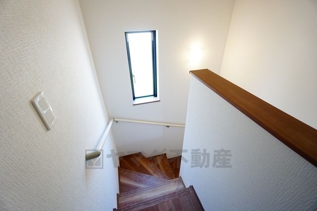 小さなお子様やご高齢の方でも安心できる、手すり付き階段。段差も低めで設定されており、安全性にも優れています。