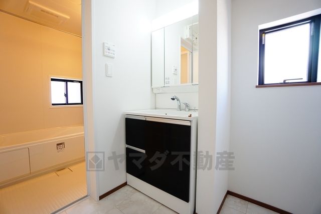 三面鏡つき洗面台。鏡裏にたっぷりとした収納スペースがあります。鏡を閉めてしまえば小物は見えないため、スッキリとした印象の洗面台にできます。