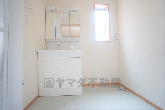 同仕様写真。三面鏡つき洗面台。鏡裏にたっぷりとした収納スペースがあります。鏡を閉めてしまえば小物は見えないため、スッキリとした印象の洗面台にできます。