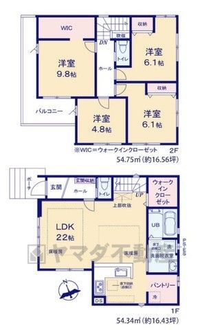 LDK22畳(1F)、洋4.8畳(2F)、洋6.1畳(2F)、洋9.8畳(2F) |