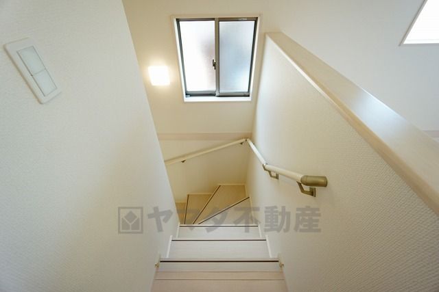 同仕様写真。お子様も高齢の方も安心して上り下りができる手摺がついた安心設計です。 階段には小窓を配置しました。日中でも暗くなりがちな階段下が明るくなり安全ですね。