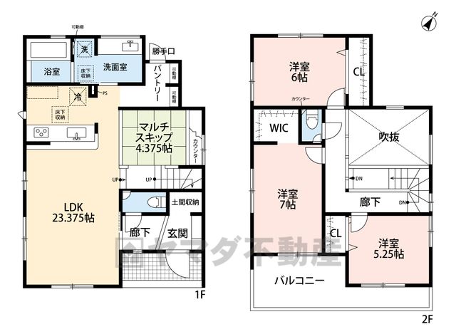LDK23.3畳(1F)、和4.3畳(1F)、洋5.2畳(2F)、洋6畳(2F)、洋7畳(2F) |