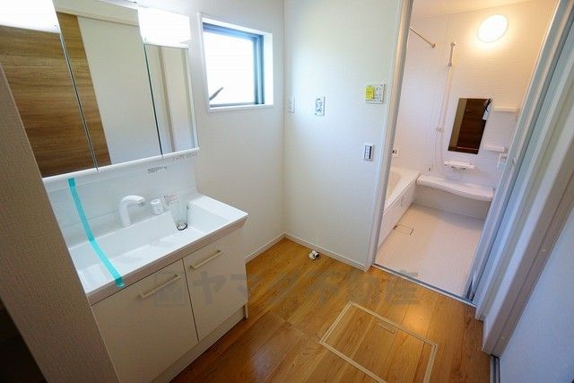 同仕様写真。三面鏡裏収納付き洗面化粧台です^^ 歯磨きセットやスキンケア用品などの収納に便利ですね。 生活感も隠すことができ、来客時にも安心です。