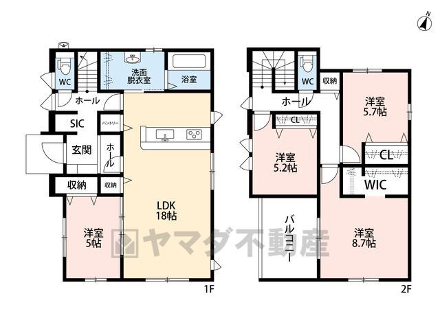 LDK18畳(1F)、洋5畳(1F)、洋5.2畳(2F)、洋5.7畳(2F)、洋8.7畳(2F) |
