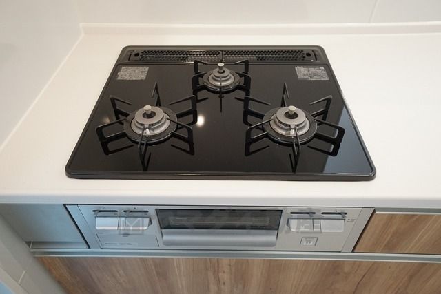 同仕様写真。3種類の料理が同時に調理できる、3口ガスコンロ。忙しい夕食の支度時間が短縮できて効率よくお料理が楽しめます。