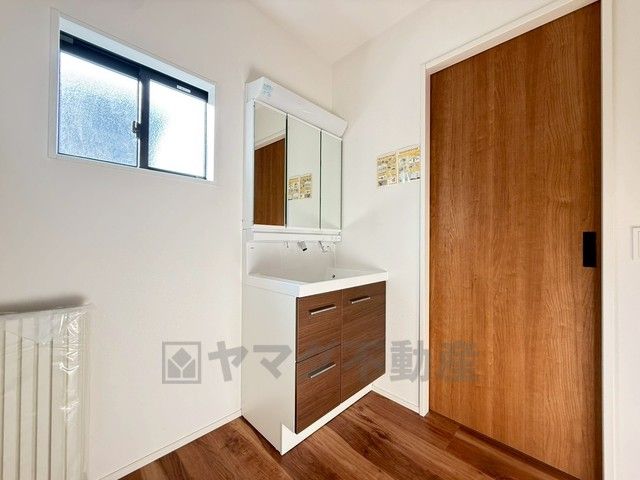 三面鏡裏収納付き洗面化粧台です^^ 歯磨きセットやスキンケア用品などの収納に便利ですね。 生活感も隠すことができ、来客時にも安心です。