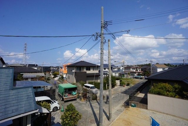 住宅地ですが隣家との高さを変えてバルコニーを設置しているので景色を楽しめるようになっています。また南向きで陽射しも確保しています。