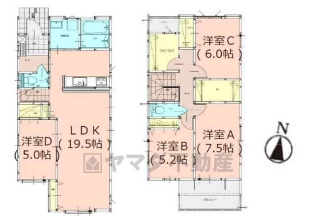 LDK19.5畳(1F)、洋5畳(1F)、洋5.2畳(2F)、洋6畳(2F)、洋7.5畳(2F) |