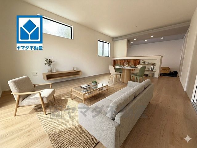 家具はイメージです。リビングは広々とした設計で、家族が集い、寛ぐ暮らしの空間を演出しています。思い思いの時間を過ごしたり、家族みんなで食事をしたり、素敵な団らんの場になりますね。