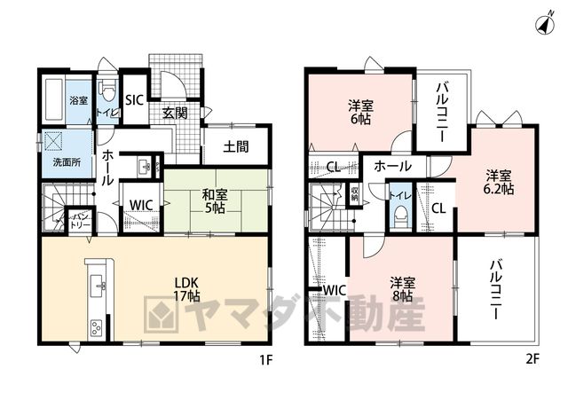 LDK17畳(1F)、和5畳(1F)、洋6畳(2F)、洋6.2畳(2F)、洋8畳(2F) |
