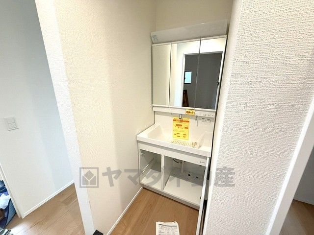 三面鏡つき洗面台。鏡裏にたっぷりとした収納スペースがあります。鏡を閉めてしまえば小物は見えないため、スッキリとした印象の洗面台にできます。