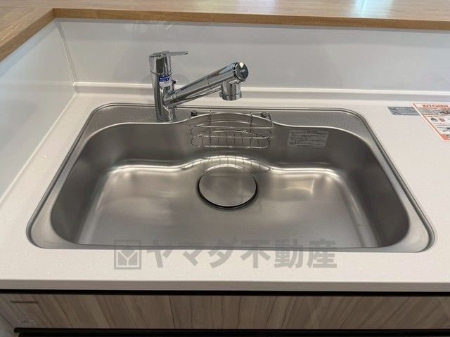広々としたステンレスシンクには、洗剤やスポンジを収納出来るラック付き。広さも確保しているので、大きなお鍋も洗いやすいです。