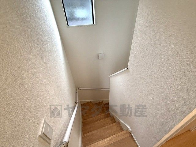 小さなお子様やご高齢の方でも安心できる、手すり付き階段。段差も低めで設定されており、安全性にも優れています。