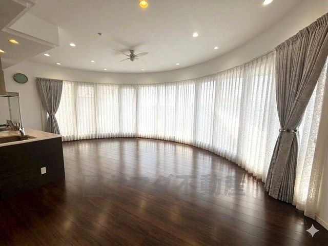 大きな曲線の窓からたっぷりの自然光が差し込む、開放感あふれるリビング空間。