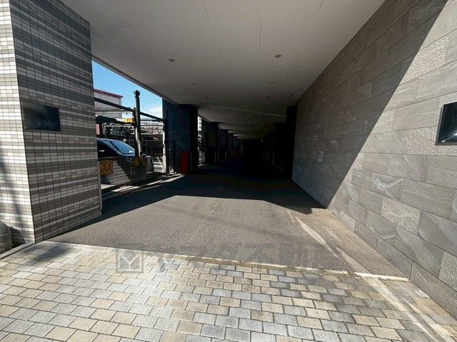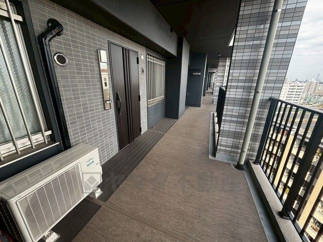落ち着いたデザインの玄関アプローチ。共用廊下はゆとりのある造りで開放感があり、通風や採光にも配慮された快適な住環境です。高層階ならではの景色も感じられる、気持ちの良い玄関まわりです。