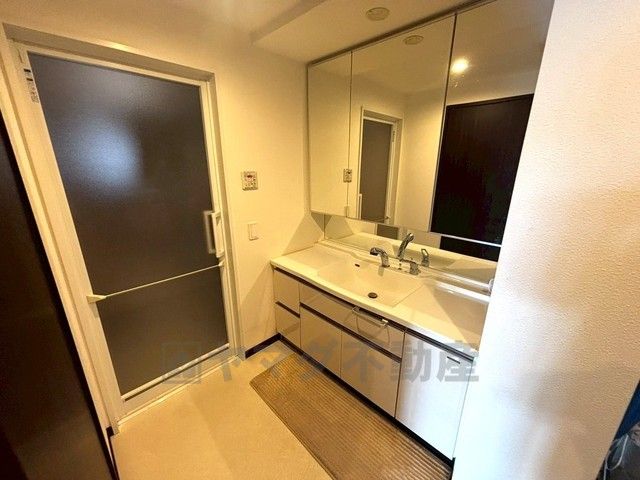 三面鏡つき洗面台。鏡裏にたっぷりとした収納スペースがあります。鏡を閉めてしまえば小物は見えないため、スッキリとした印象の洗面台にできます。